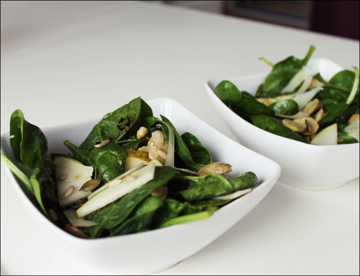 Bardzo lubię świeży szpinak, mimo że na surowo nie ma on wyrazistego smaku. Ale to wynika chyba z mojej ogólnej miłości do zieleniny. Sałatka, którą przedstawiam poniżej jest moją modyfikacją przepisu zaproponowanego na opakowaniu szpinaku.